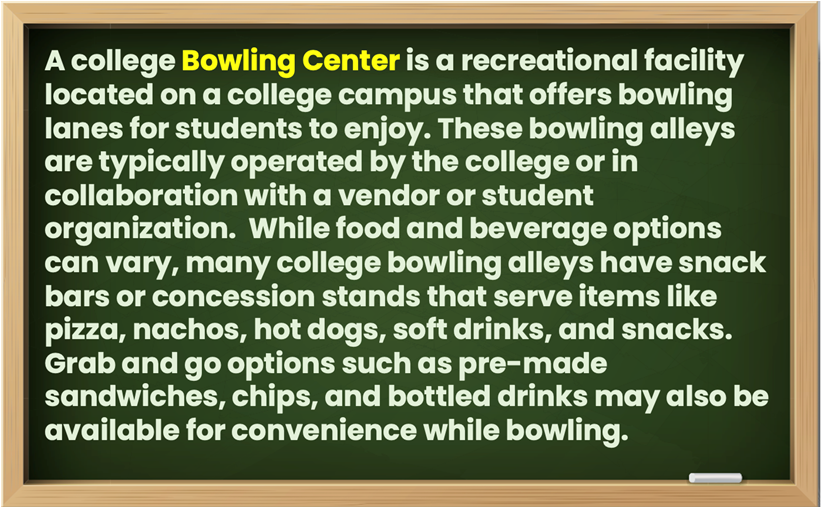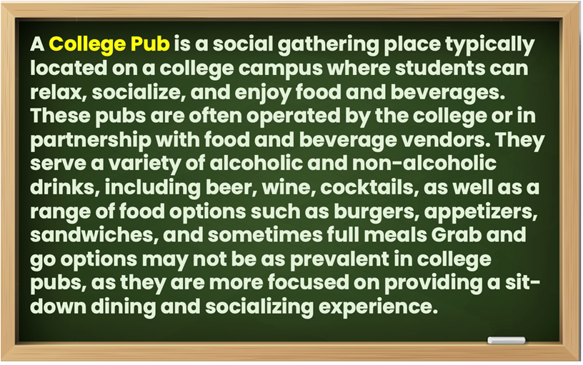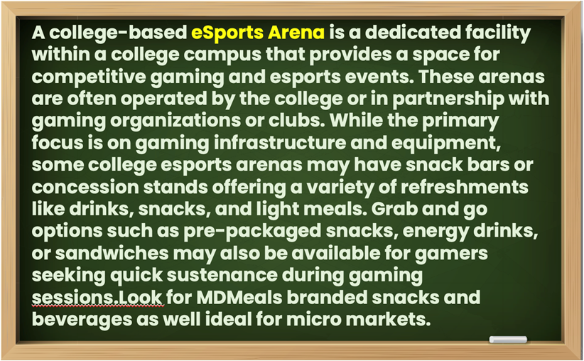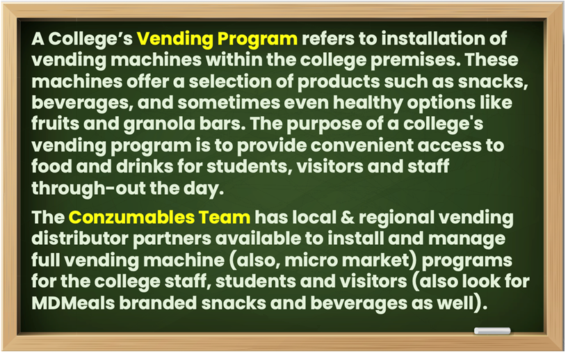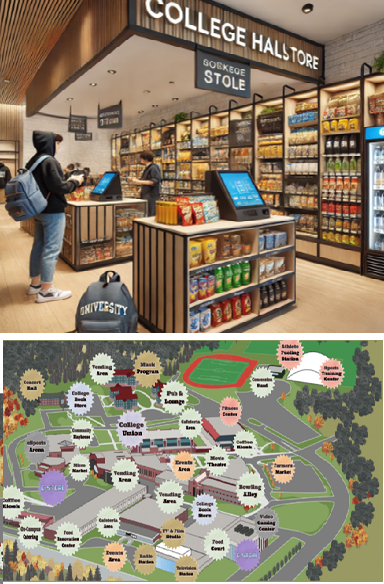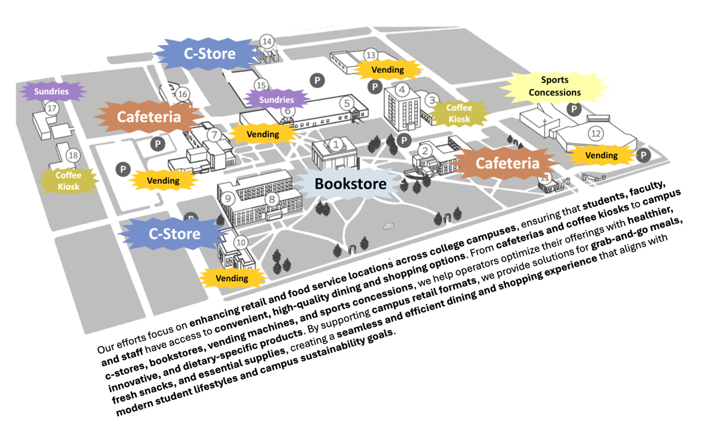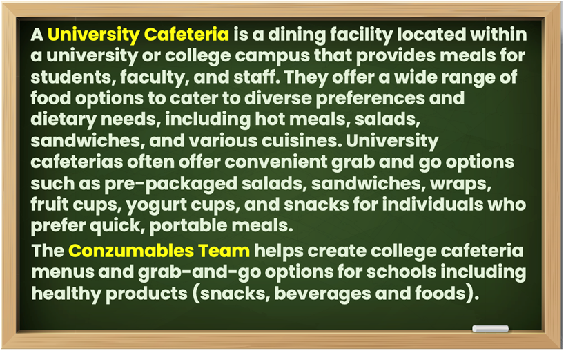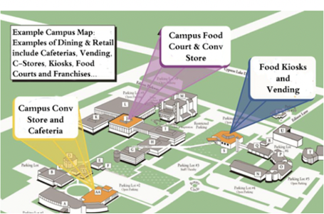 The College and University can have any of the following areas for consumer products: a Vending Area, a Cafeteria, a Coffee Kiosk, a Concession Stand, a Book Store, a Sports Training Center and more.