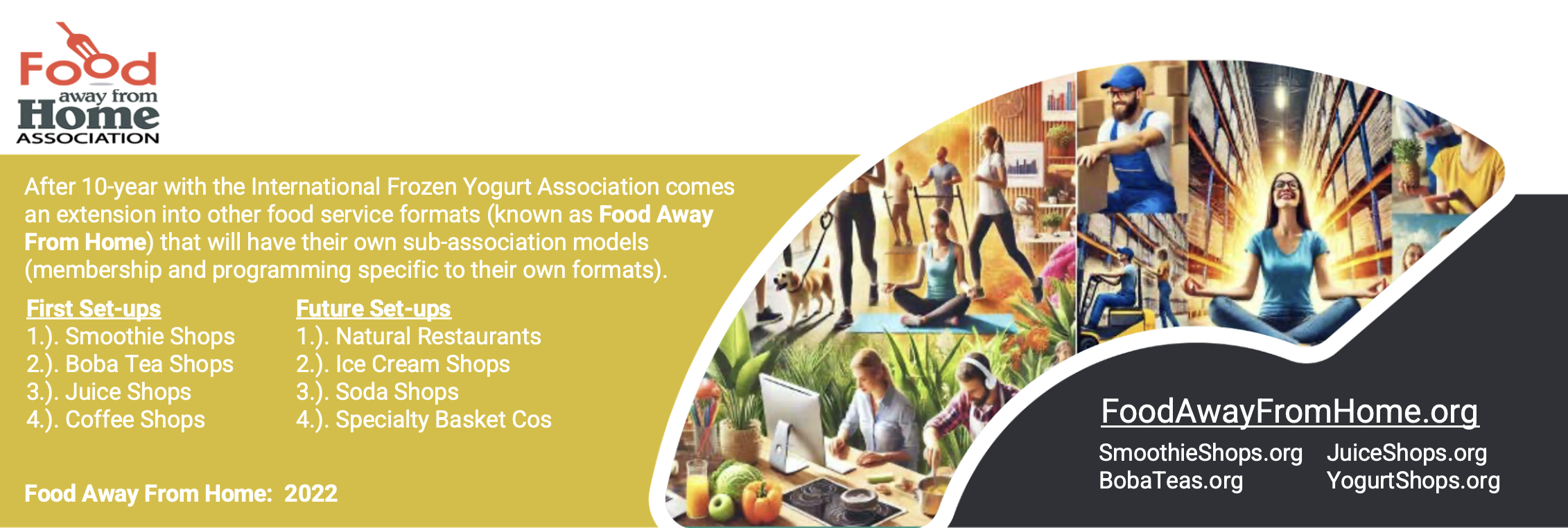 FOOD SERVICE FORMATS: The Food Away From Home Association’s founders have been involved in the Food Service industry (as suppliers, partners and media) for many years. Our new membership will include operators and franchisors as well as others such as food service providers, chains, distributors, associations and more. We are also expanding into healthy option ideas and introductions for their customers (smoothie, juice, boba tea and yogurt).