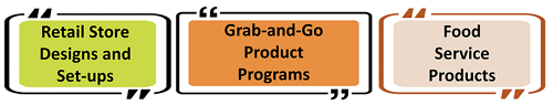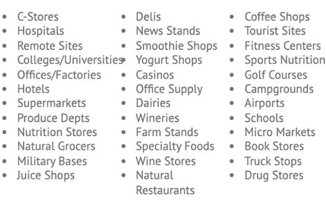 Our Grab-and-Go program (ex: smoothie shops, juice shops, boba tea shops) includes beverages, candy, energy bars, brownies, fruit snacks, dairy products, ice cream, sports nutrition products, macarons, croissants and others.
